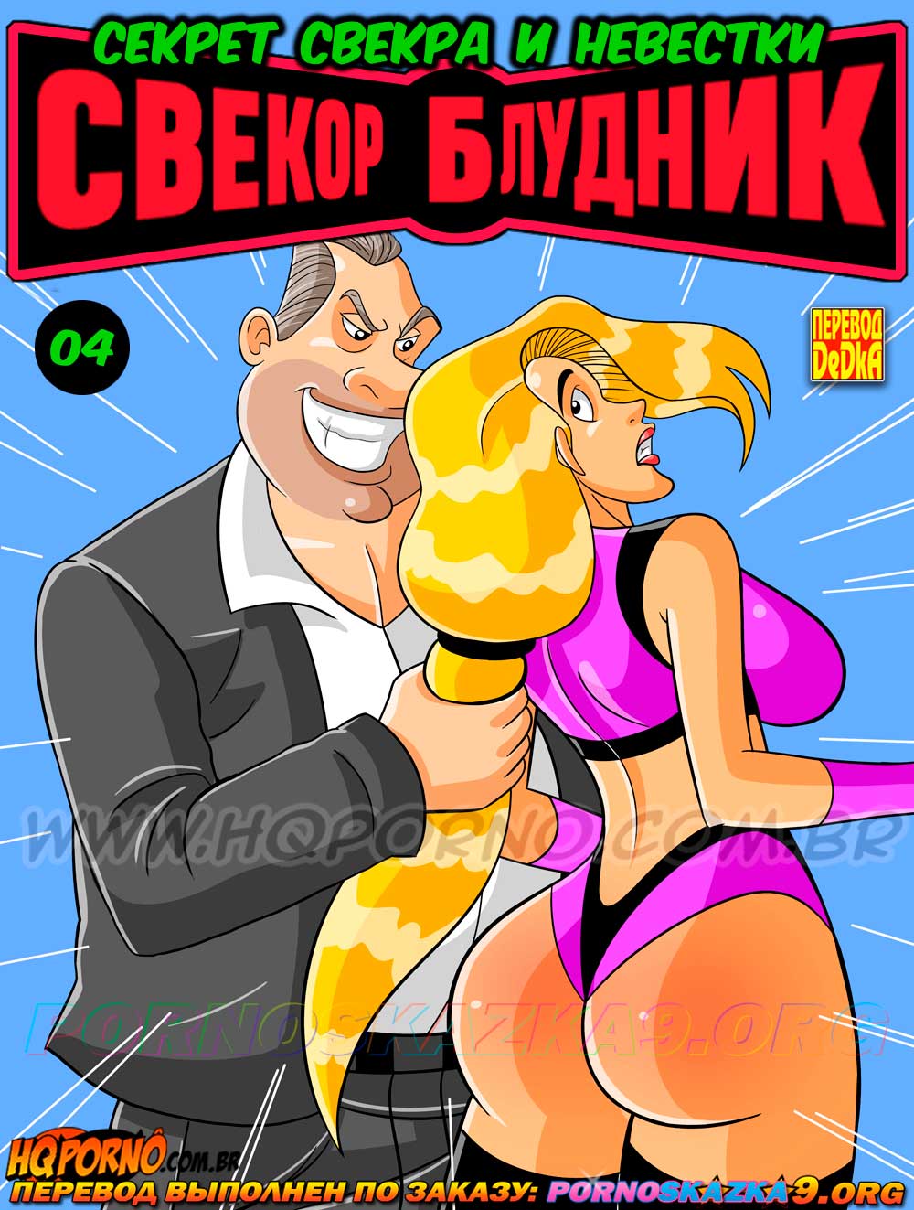 Порно комикс «Свекор блудник 4. Секрет свекра и невестки.» В первую годовщину свадьбы Эллен и Алекс всю ночь занимались таким бурным сексом, какого у них не было даже в первую брачную ночь. Вскоре после этого Эллен однажды утром снова захотела такого же секса, но муж отказывал ей под предлогом того, что он безработный, и спешит на собеседование на другой конец города. Вскоре после ухода Алекса в доме своей невестки появился Линей и рассказал Эллен, что это именно он трахал ее пьяную в ночь первой годовщины ее свадьбы с его сыном. А потом Линней сделал невестке предложение, от которого она не смогла отказаться…